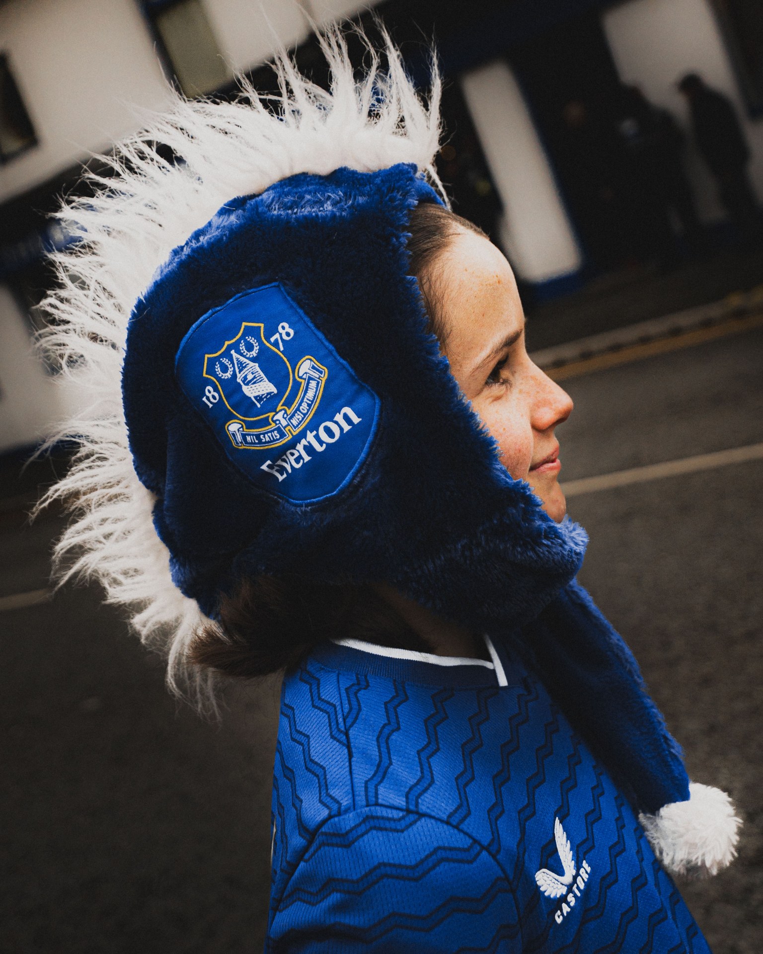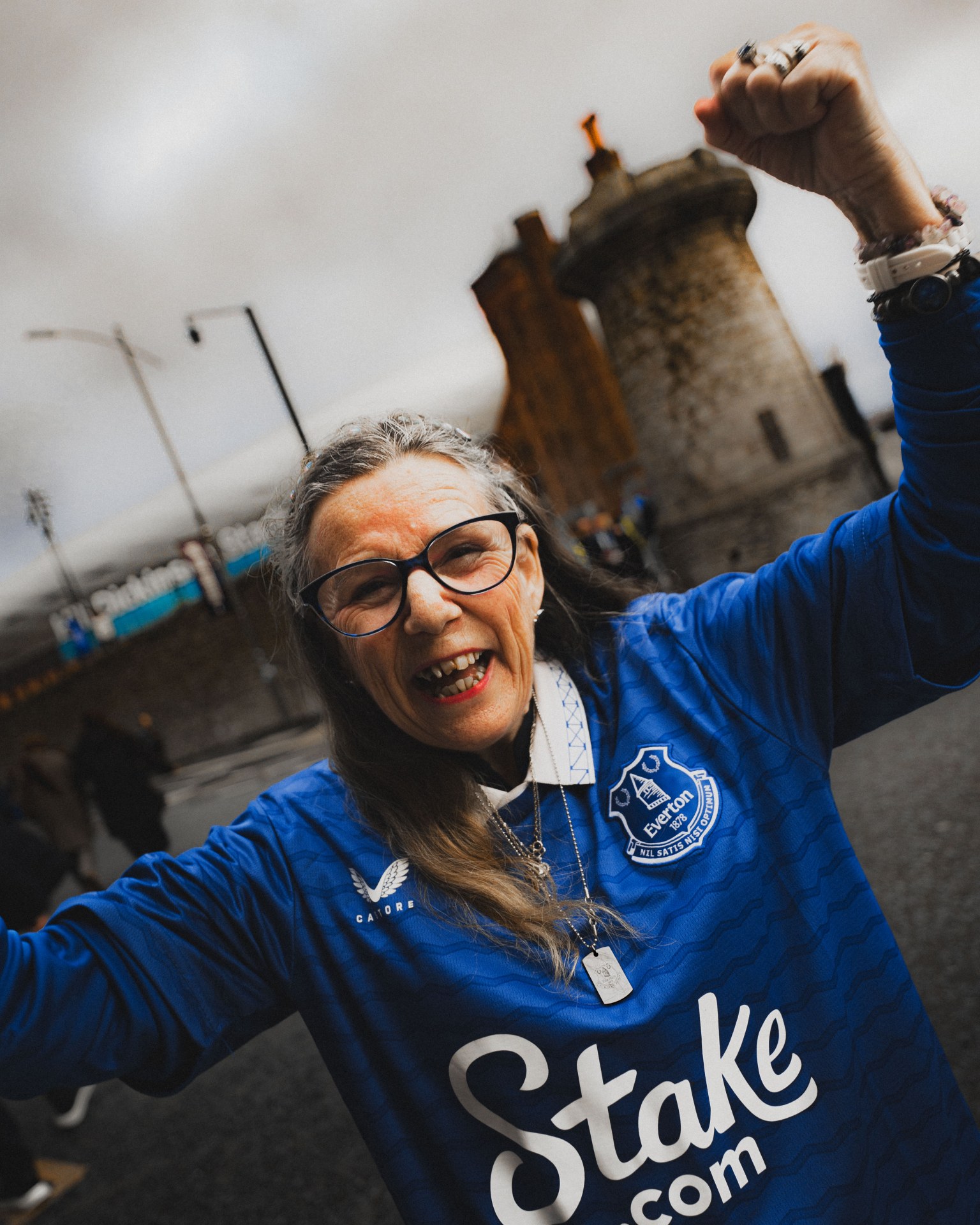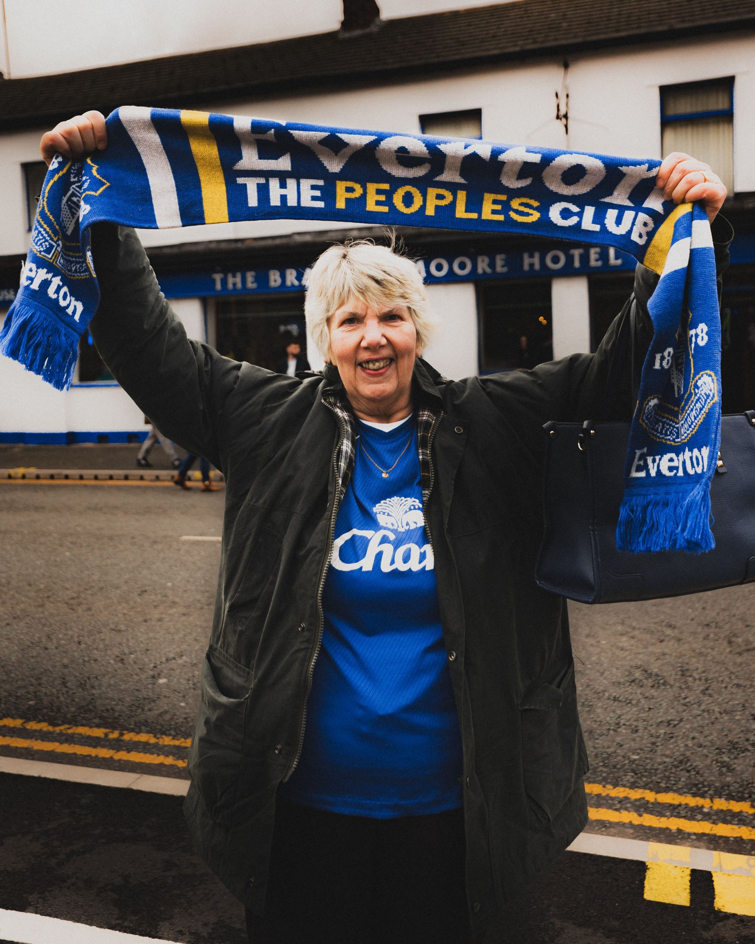 I photographed fans before the Everton v Newcastle game on a cold, rainy afternoon at Hill Dickinson Stadium – my first time shooting at the new ground! Despite the weather, the fans were full of energy as usual. One particular fan stood out to me, Pam, who caught my eye as she was dancing away in front of the DJ in The Bluehouse bar. Head to toe Everton, including her socks!